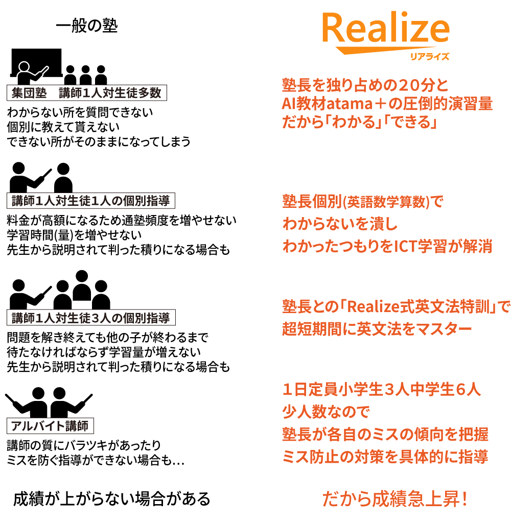 中1で習うbe動詞一般動詞、進行形や人称代名詞等の基礎英文法を修得できていない子が成績上位層を含めて意外に大勢居ます。Are you go to Tokyo ?などと平気で英作文します。意味は通じるかもしれませんがテストでは×です。でも、大丈夫。「Realize式英文法特訓」で驚くほど短期間に英文法の基礎をマスターできます。マンツーマンで行う英文法特訓とは・・・先生が簡単な和文を提示し生徒は英文に翻訳します。簡単な英作文なので英語が苦手な子でもじきにできるようになります。和文にはその子がマスターすべき英文法を含めています。正答できればOK!NICE!等と褒め間違えたら正しい英文を伝えます。これをトスバッティングのように短時間に何度も繰り返すので特訓と言います。出題方法にノウハウがありますが皆さん数回の特訓でマスターすべき英文法を習得しています。